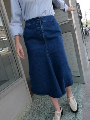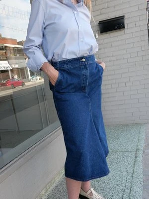 STUDIO NICHOLSON PRETO SKIRT IN INDIGO WASH. CREATING SHAPE AND MOVEMENT THROUGH CUT, THE PRETO SKIRT SITS AT THE NATURAL WAIST, CLOSELY FOLLOWING THE LINE OF THE HIPS BEFORE KICKING OUT AT THE HEM. ADDITIONAL FABRIC IN THE SKIRT’S FRONT ALLOWS FOR THIS THREE-DIMENSIONAL, DYNAMIC NATURE. INTEGRATED WAISTBAND, SQUARE PATCH POCKETS, SUBSTANTIAL DENIM TWILL. CENTRE BACK MEASURES APPROXIMATELY 30 INCHES. MADE IN ENGLAND.