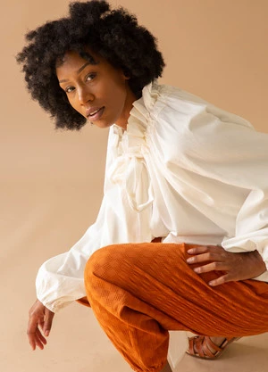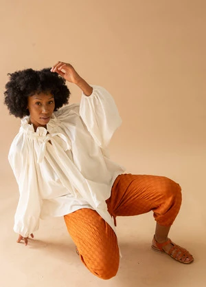 Designed by Alnea Farahbella in Los Angeles. Farahbella describes her brand as a recollection of her life experiences and travels. Toit Volant is committed to responsible, sustainable, and ethical practices. Toit Volant garments are responsibly made by a small team of highly skilled machinists and technicians at Farahbellas factory in Los Angeles, Nana Atlier.
