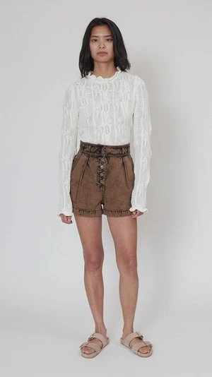 The Ares Shorts are high waisted with single pleats which creates a flattering silhouette by adding subtle volume at the leg. The shorts have Ulla Johnson’s signature double belt loops and exposed buttons at the center front. They are constructed from a denim fabric.
