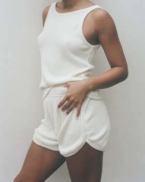 Elastic waist jogger shorts with curved hem and rib trim detail.
