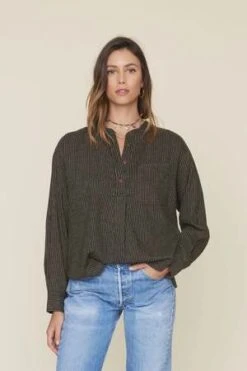 This pop-over style shirt features tonal stripes with a brushed, warm feel. This easy henley has a left chest pocket, box pleat back yoke, and pearlized snap buttons.